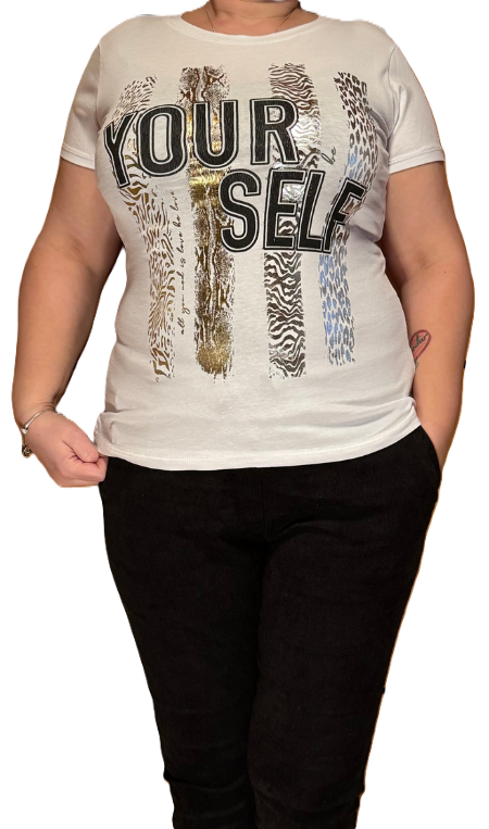 Bela majica na kratke rokave s potiskom.