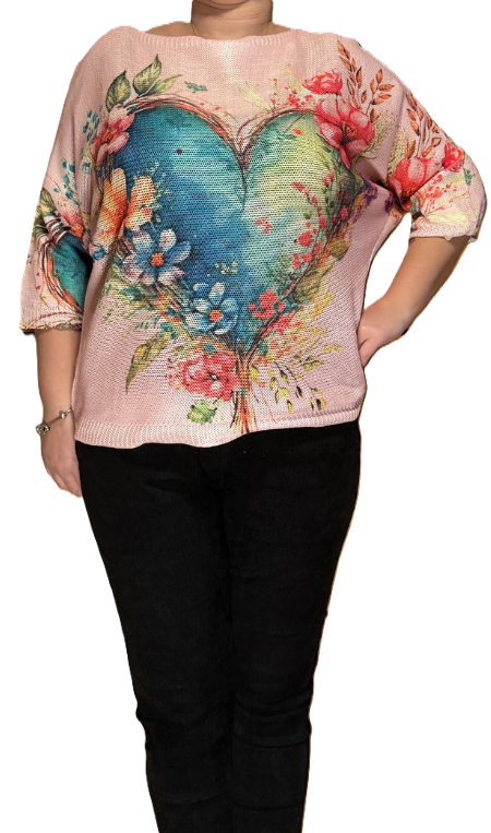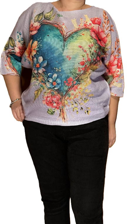 Pletenina z metuljčastimi tričetrt rokavi, potiskano srce.